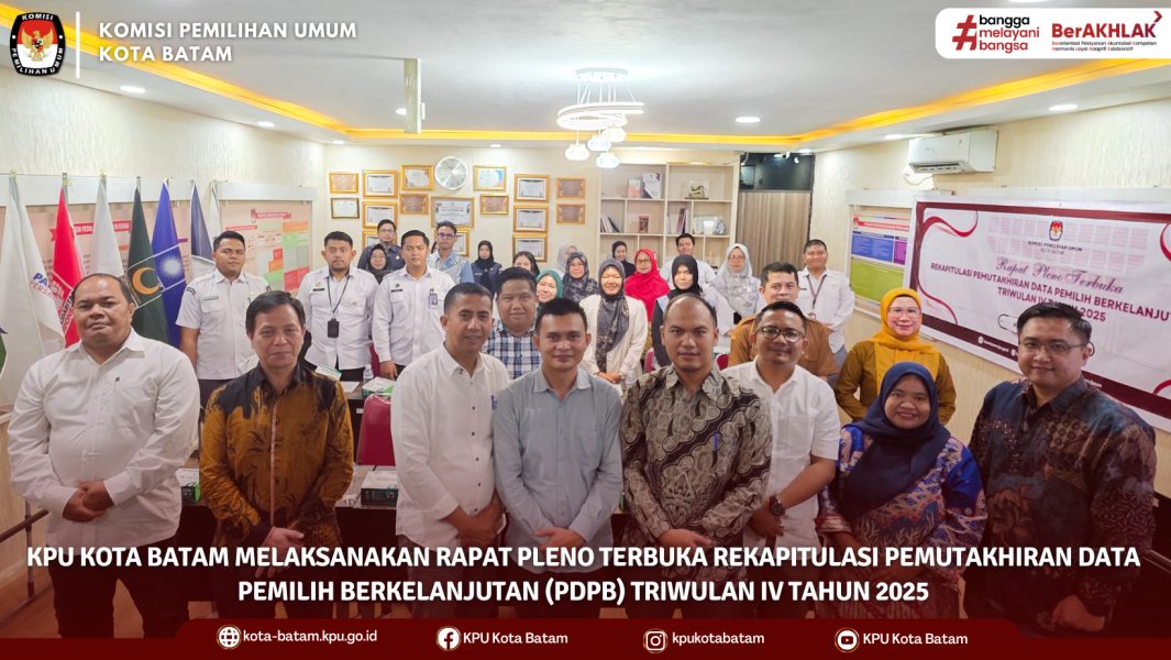 #TemanPemilih, KPU Kota Batam melaksanakan Rapat Pleno Terbuka Rekapitulasi Pemutakhiran Data Pemilih Berkelanjutan (PDPB) Triwulan IV Tahun 2025 Tingkat Kota Batam yang dilaksanakan di Rumah Pintar Pemilu (RPP) Kantor KPU Kota Batam, Senin (8/12/2025). Rapat yang digelar secara luring di RPP Kantor KPU Kota Batam ini dipimpin langsung oleh Ketua KPU Kota Batam dan turut hadir Anggota KPU Provinsi Kepulauan Riau Ferry Mulyadi Manalu, Anggota KPU Kota Batam Adri Wislawawan, Bosar Hasibuan, Aksara Pandapotan Manurung, Plh. Sekretaris KPU Kota Batam Mira Armaya, Kasubbag Perencanaan, Data dan Informasi Nurligen Idawati Nadeak dan Staf Sekretariat KPU Kota Batam serta dihadiri oleh seluruh stakeholder terkait. KPU Kota Batam berkomitmen untuk terus melakukan pemutakhiran data pemilih secara berkelanjutan, serta membuka ruang bagi masyarakat untuk memberikan masukan baik melalui layanan daring maupun langsung di kantor KPU Kota Batam. #KPUMelayani #KPUBatam #PDPBTWIV #DataPemilih ....