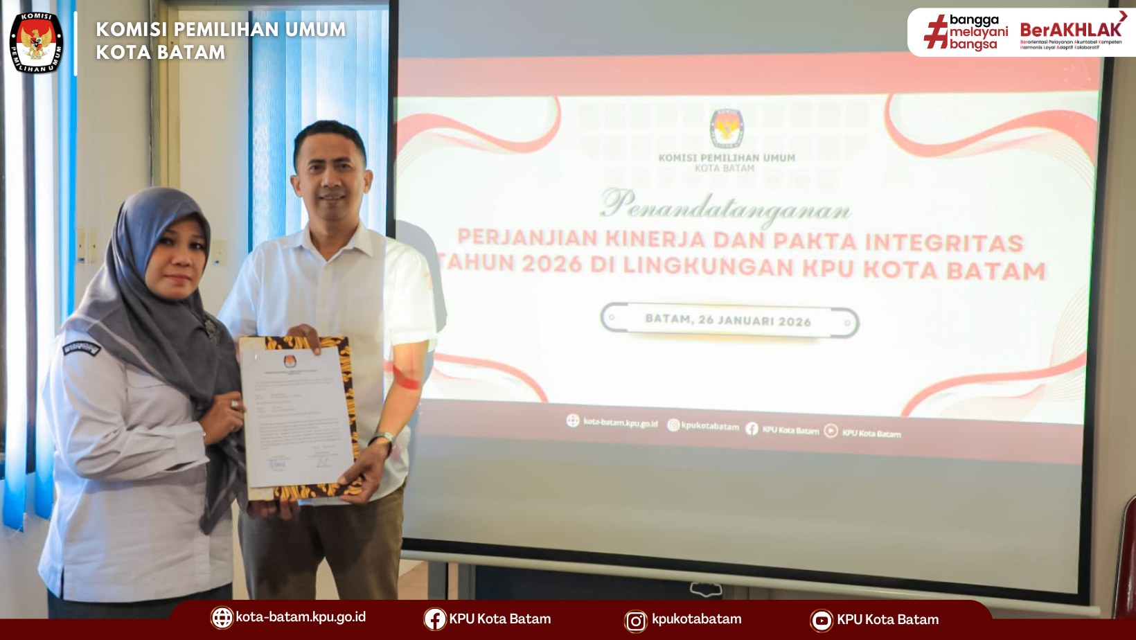 Komisi Pemilihan Umum (KPU) Kota Batam melaksanakan penandatanganan Perjanjian Kinerja dan Pakta Integritas Tahun 2026 yang diikuti oleh Ketua dan Anggota KPU Kota Batam Mawardi, Adri Wislawawan, Bosar Hasibuan dan Rosdiana, Plt. Sekretaris Mira Armaya, Kasubbag, serta seluruh jajaran sekretariat KPU Kota Batam. Kegiatan ini berlangsung di Ruang Rapat Lantai 2 Kantor KPU Kota Batam, Senin (26/1/2026).