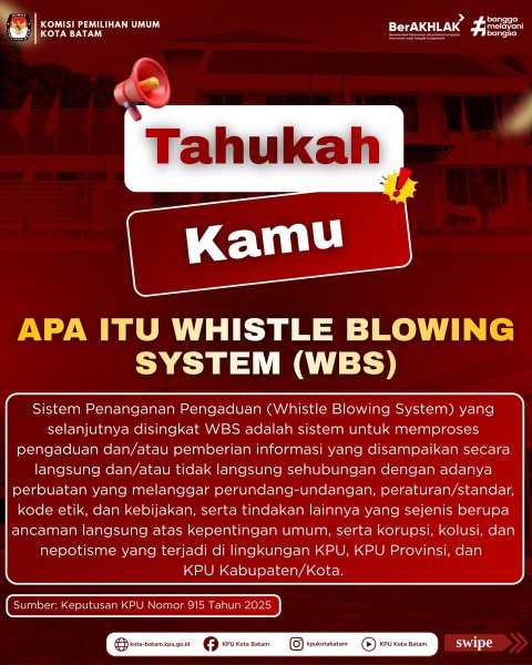 Whistle Blowing System adalah sarana yang disediakan oleh KPU Kota Batam bagi anda yang memiliki informasi dan ingin melaporkan suatu perbuatan berindikasi pelanggaran yang terjadi di lingkungan KPU Kota Batam.