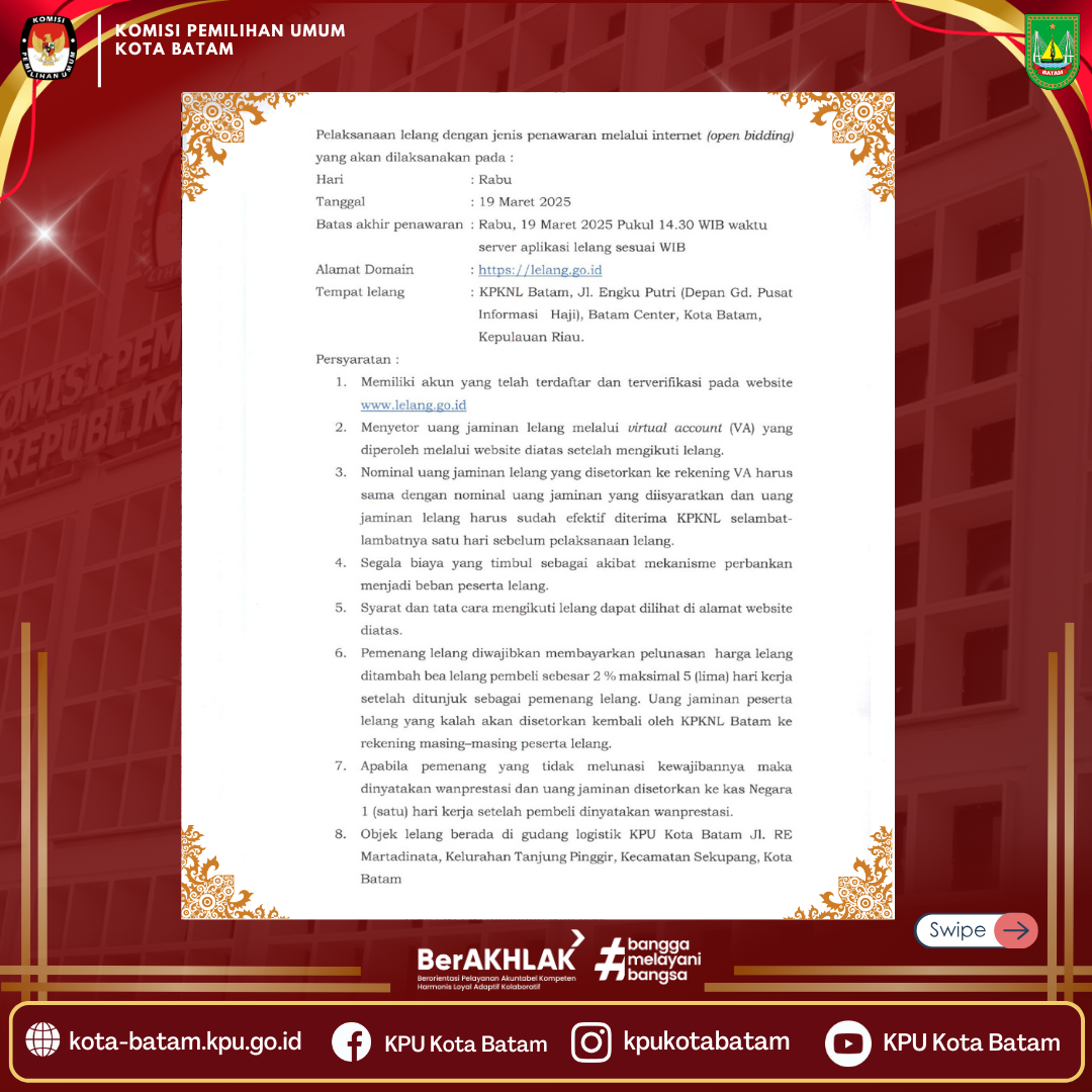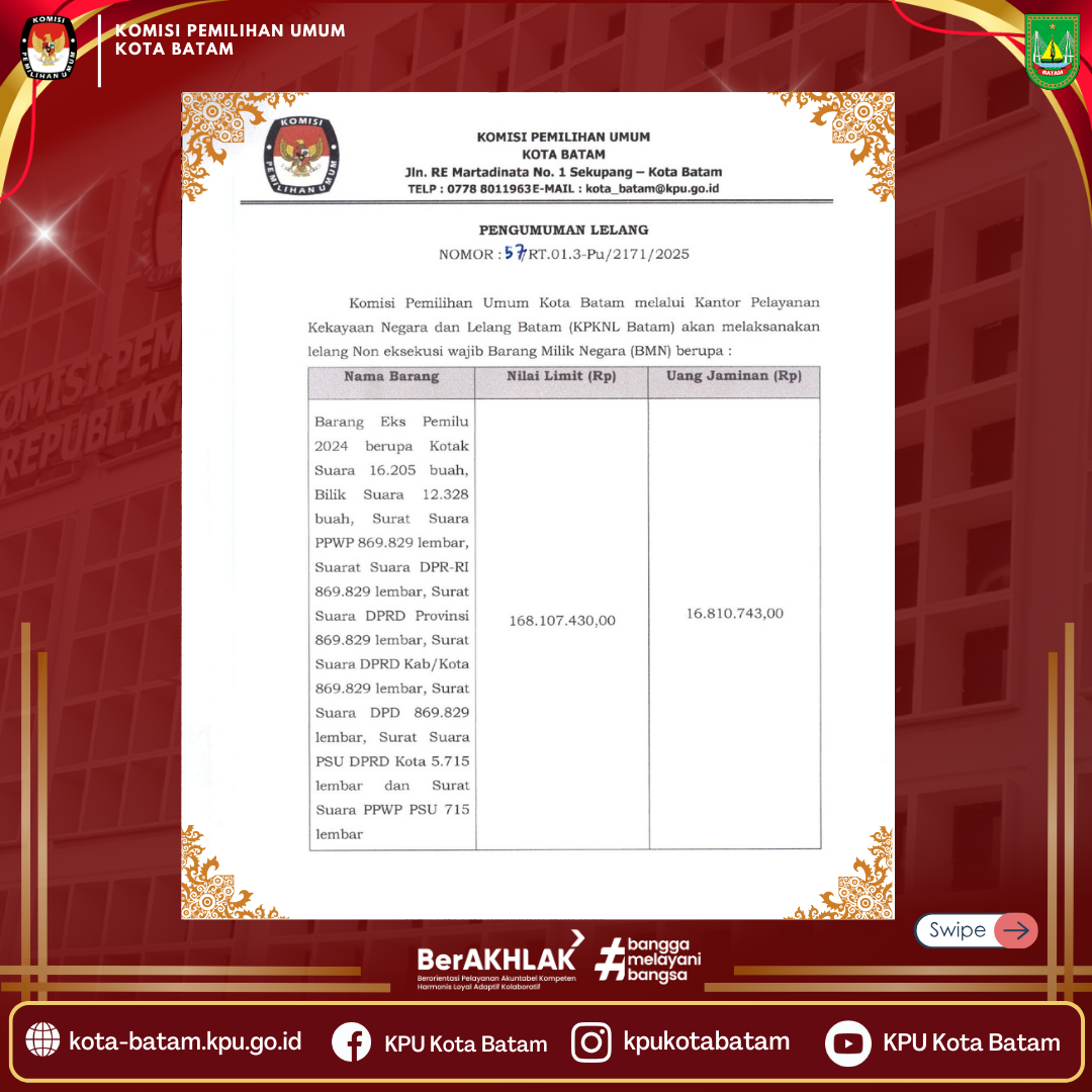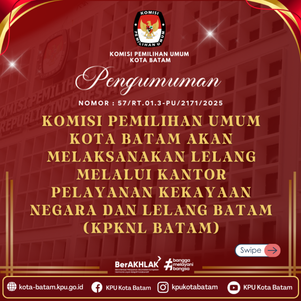 #temanpemilih, berikut adalah Pengumuman Lelang Komisi Pemilihan Umum Kota Batam Nomor : 57/RT.01.3-Pu/2171/2025 melalui Kantor Pelayanan Kekayaan Negara dan Lelang Batam (KPKNL Batam).