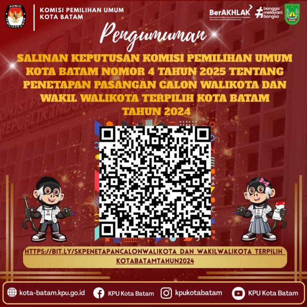 #temanpemilih, Berikut Salinan Keputusan Komisi Pemilihan Umum Kota Batam Nomor 4 Tahun 2025 Tentang Penetapan Pasangan Calon Walikota dan Wakil Walikota Terpilih Kota Batam Tahun 2024 dapat diakses melalui scan barcode ini.