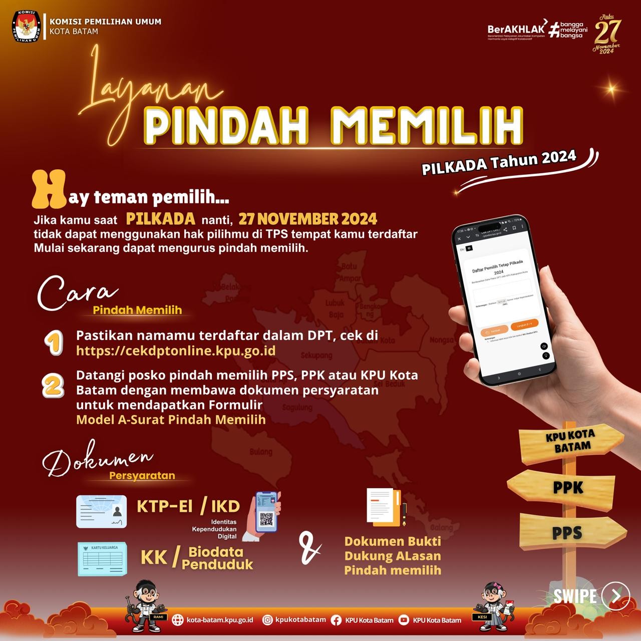 Mulai dari sekarang kamu sudah bisa mengurus pindah memilih secara langsung ke Posko-Posko layanan pindah memilih untuk didaftarkan sebagai DPTb di KPU Kota Batam dan PPK/PPS se-Kota Batam, kamu juga bisa konsultasi terlebih dahulu dengan menghubungi cp kami di nomor 0823 8979 4351 (Mona).