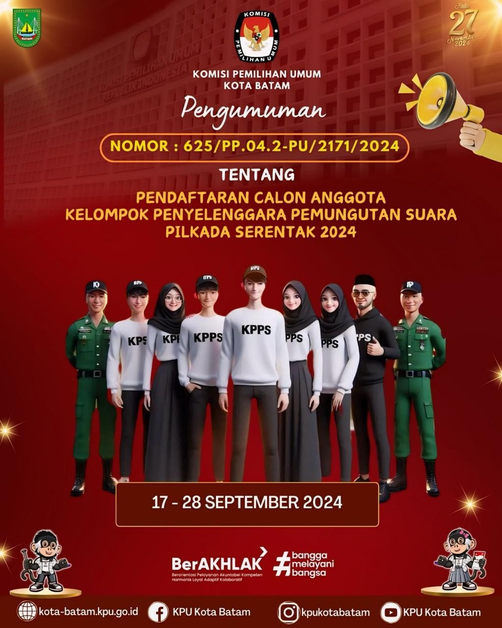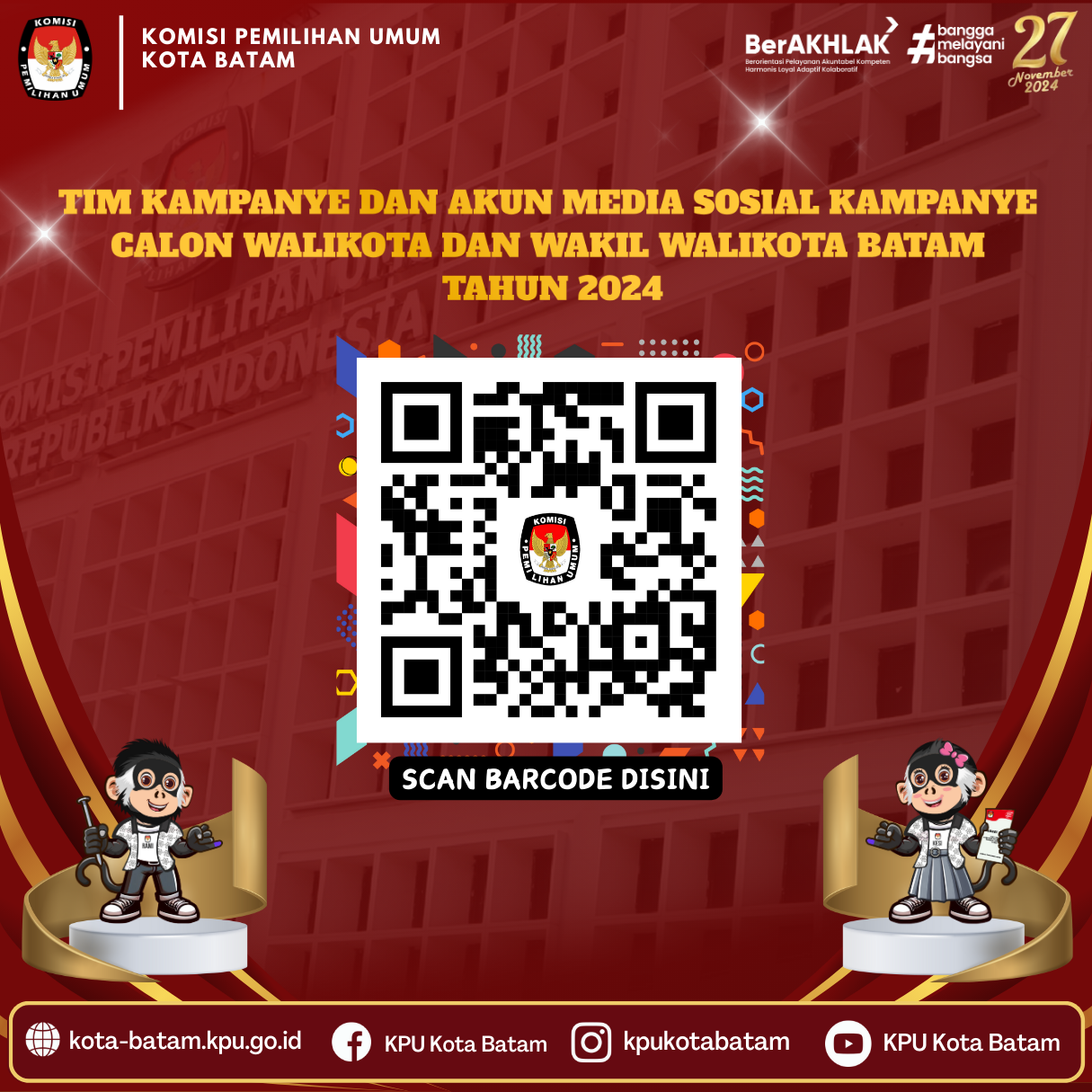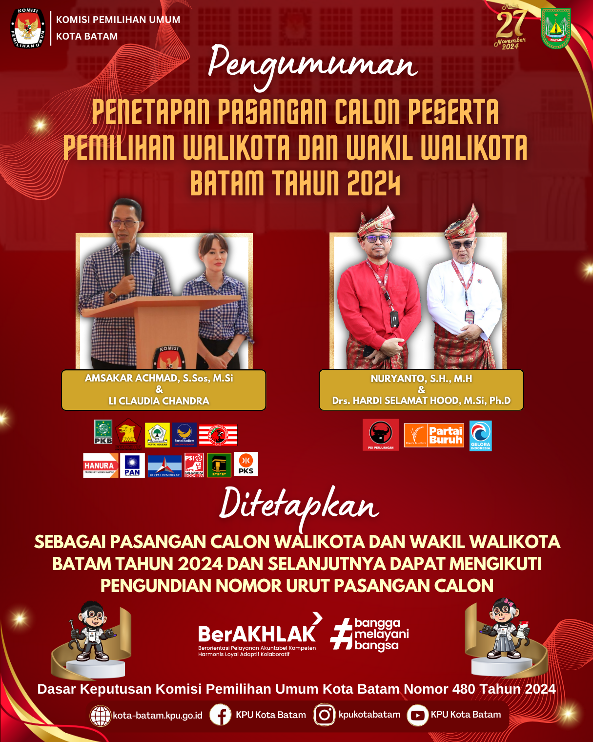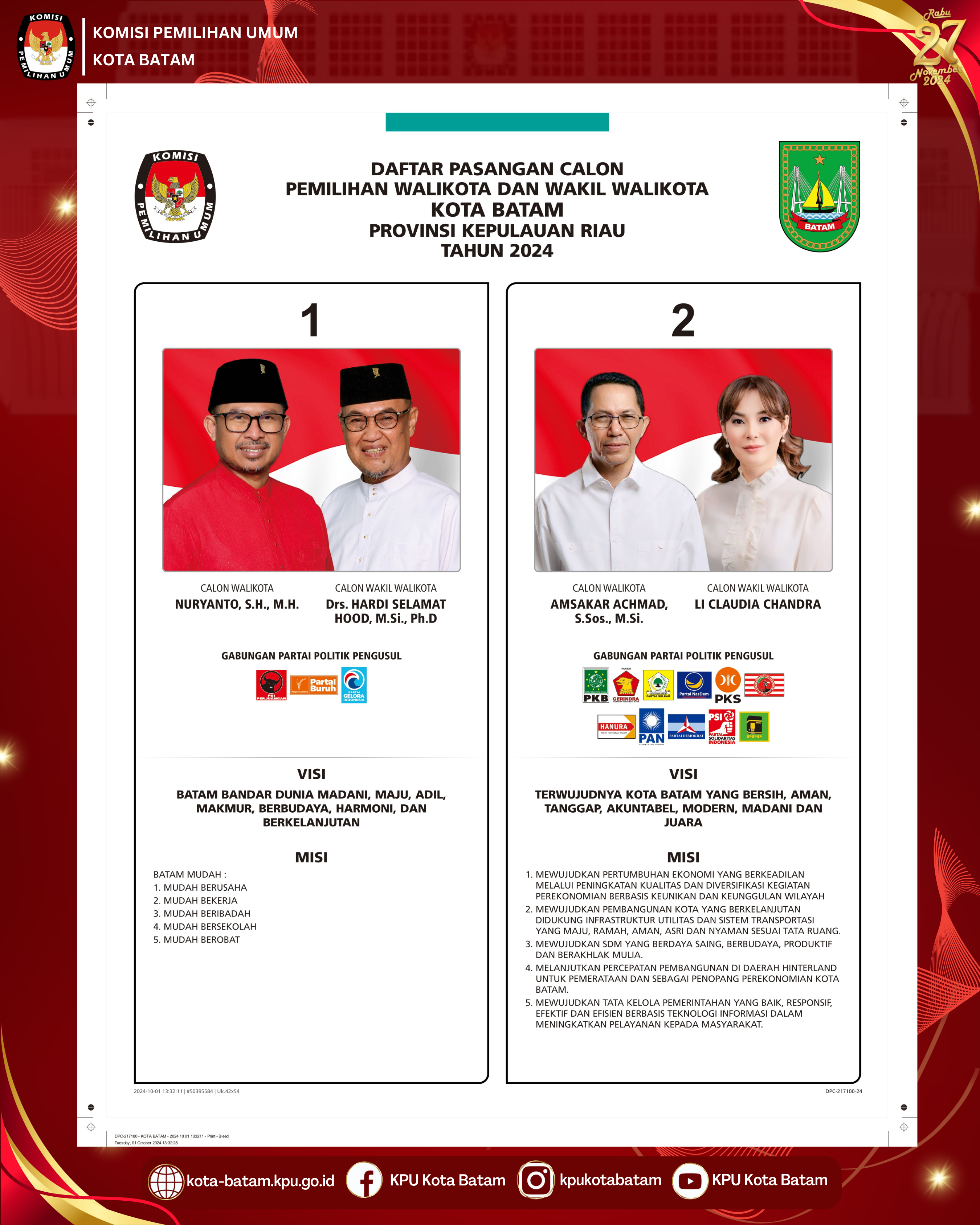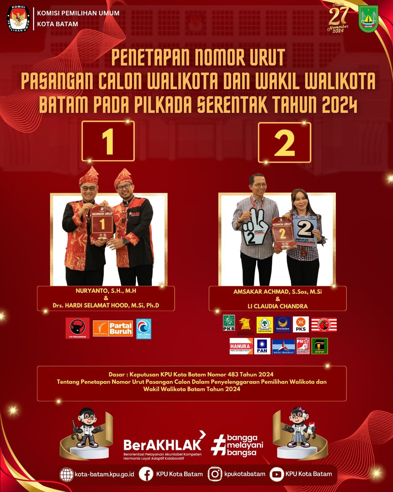 Hai #TemanPemilih, Berikut disampaikan Penetapan Nomor Urut Pasangan Calon Walikota dan Wakil Walikota Batam Pada Pilkada Serentak Tahun 2024.
