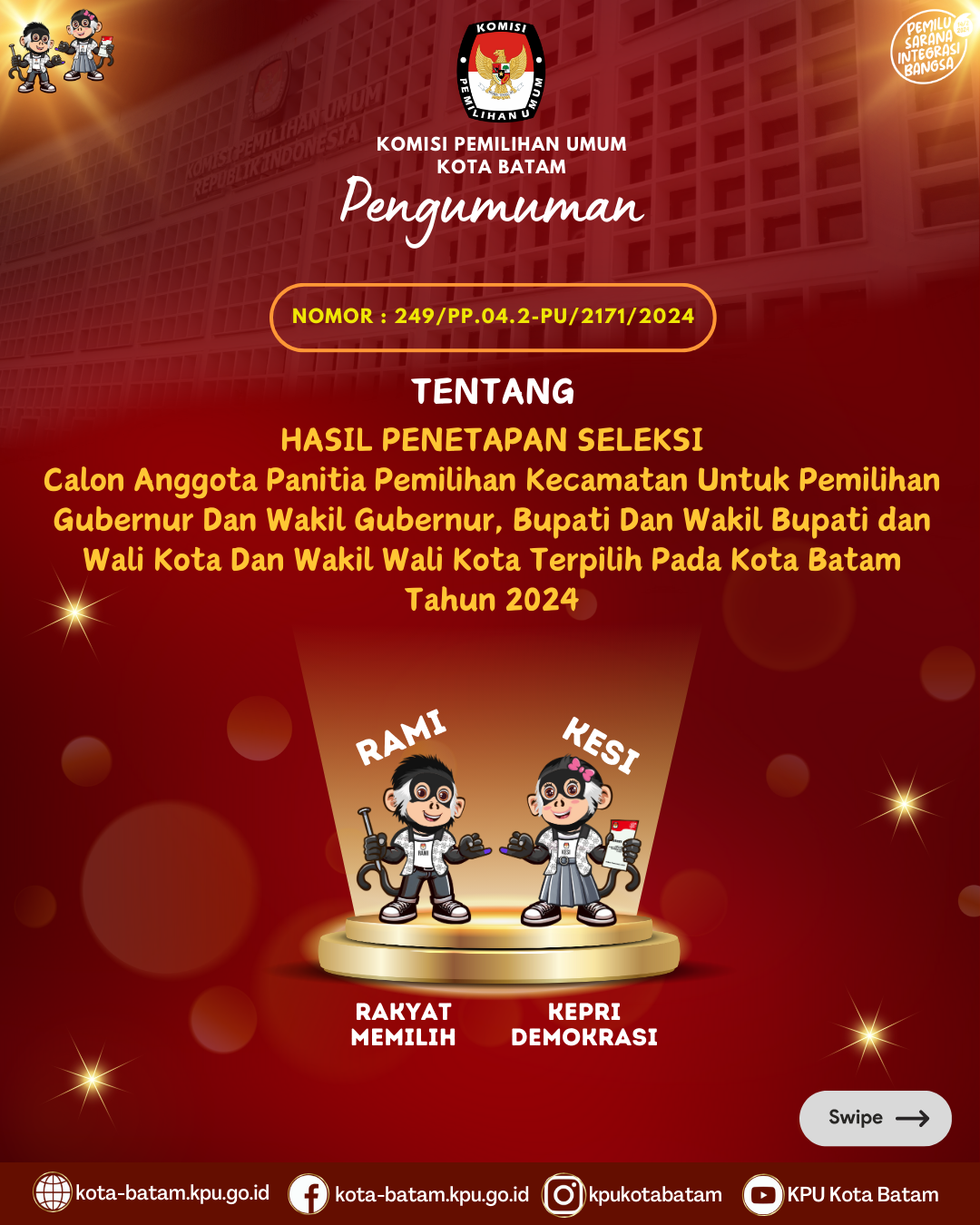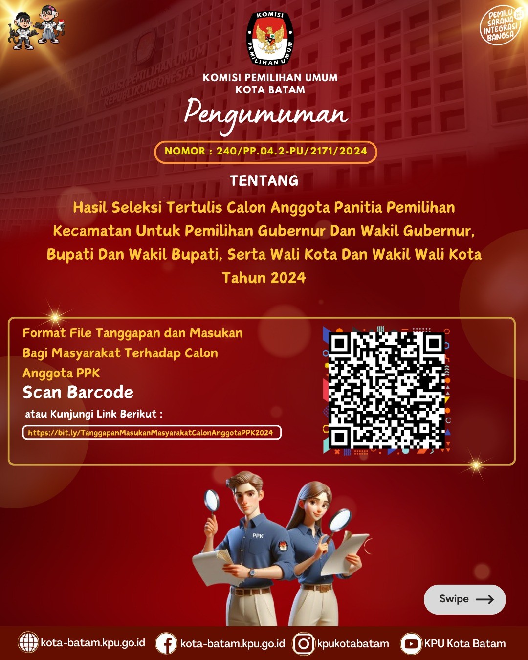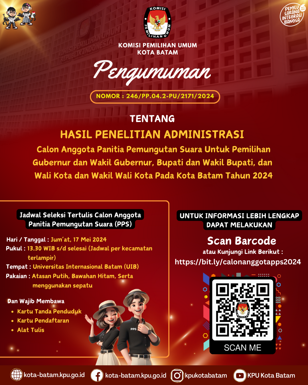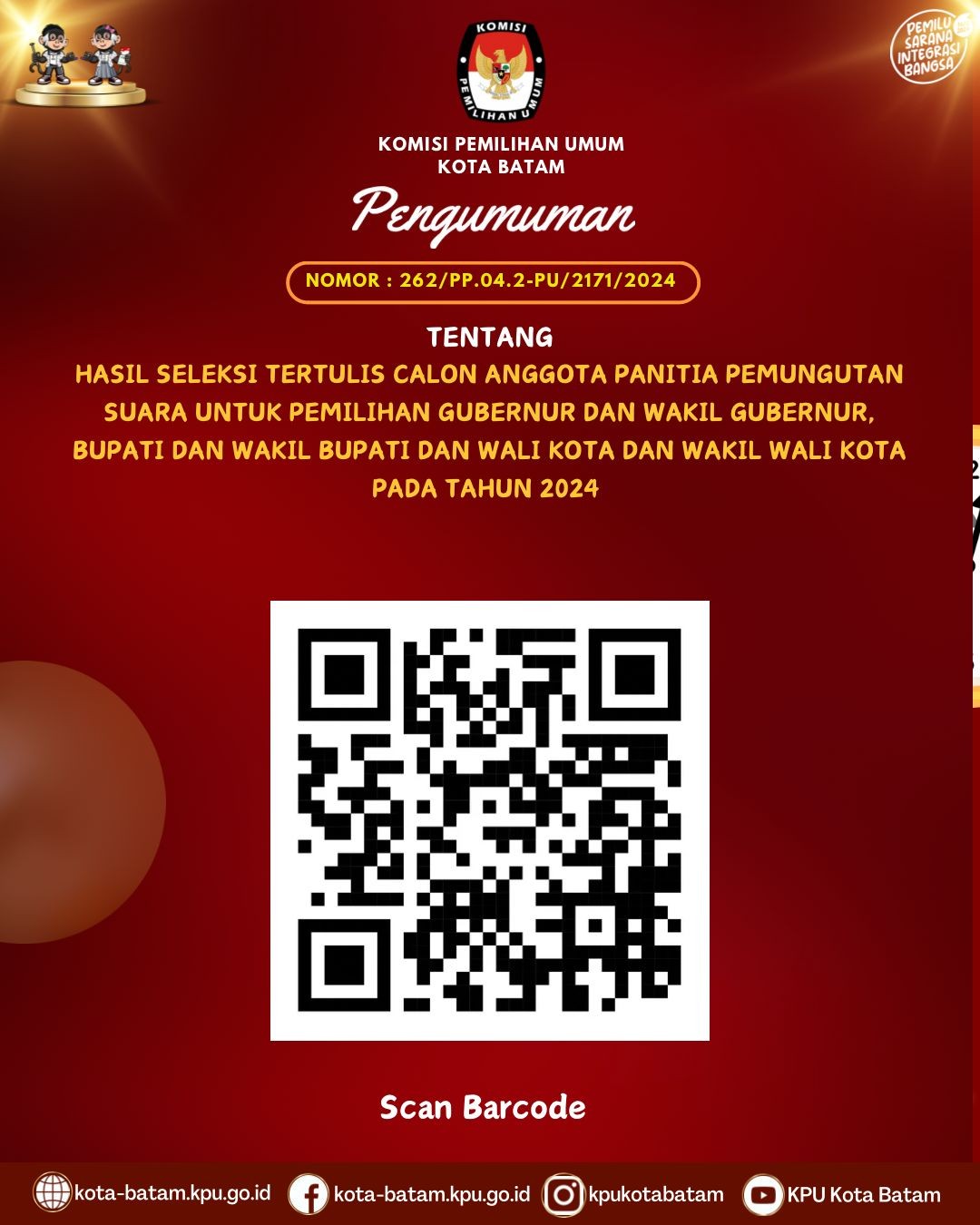 Berikut Pengumuman Nomor : 246/PP.04.2-Pu/2171/2024 Tentang Hasil Penelitian Administrasi Calon Anggota Panitia Pemungutan Suara Untuk Pemilihan Gubernur dan Wakil Gubernur, Bupati dan Wakil Bupati, dan Wali Kota dan Wakil Wali Kota Pada Kota Batam Tahun 2024.