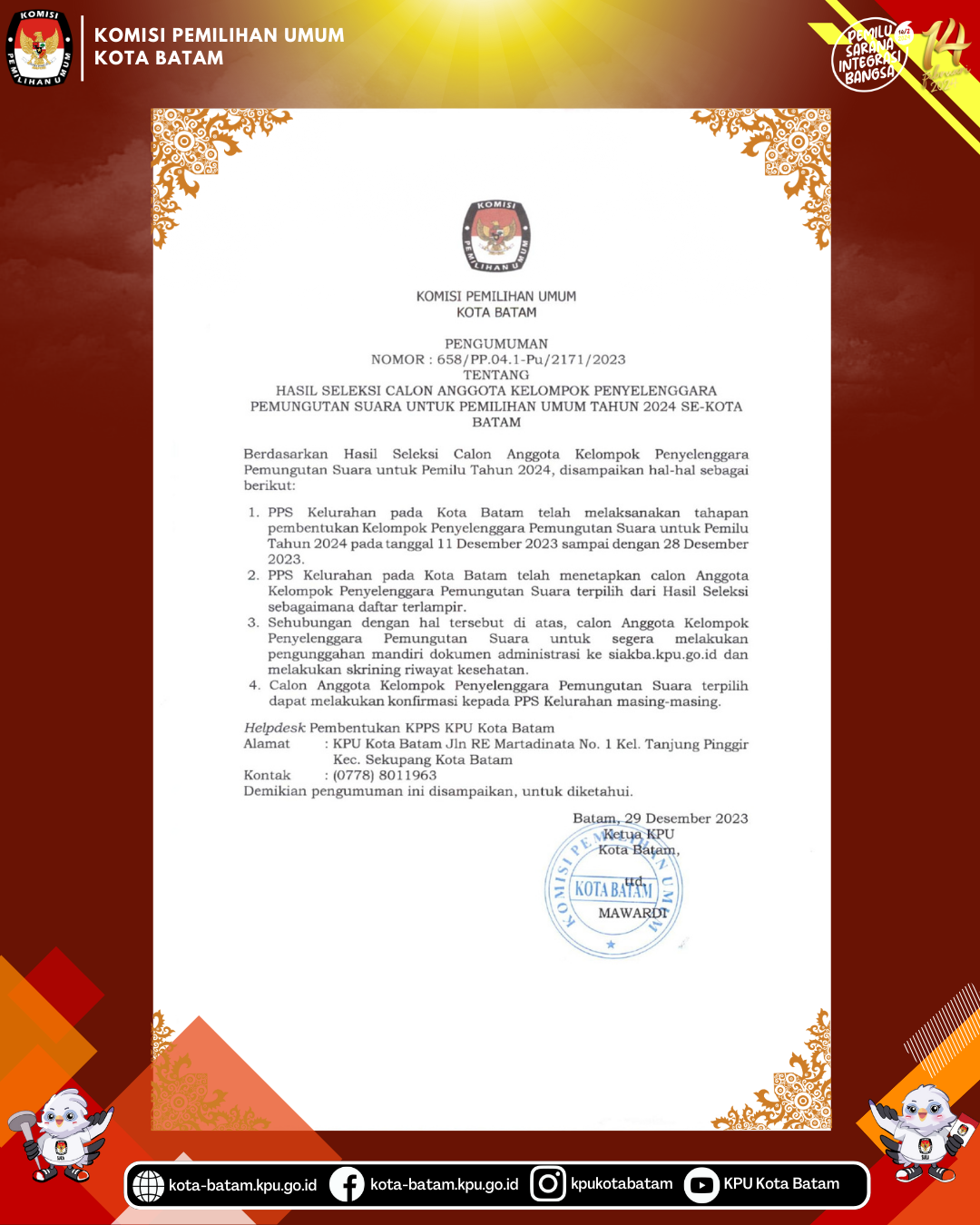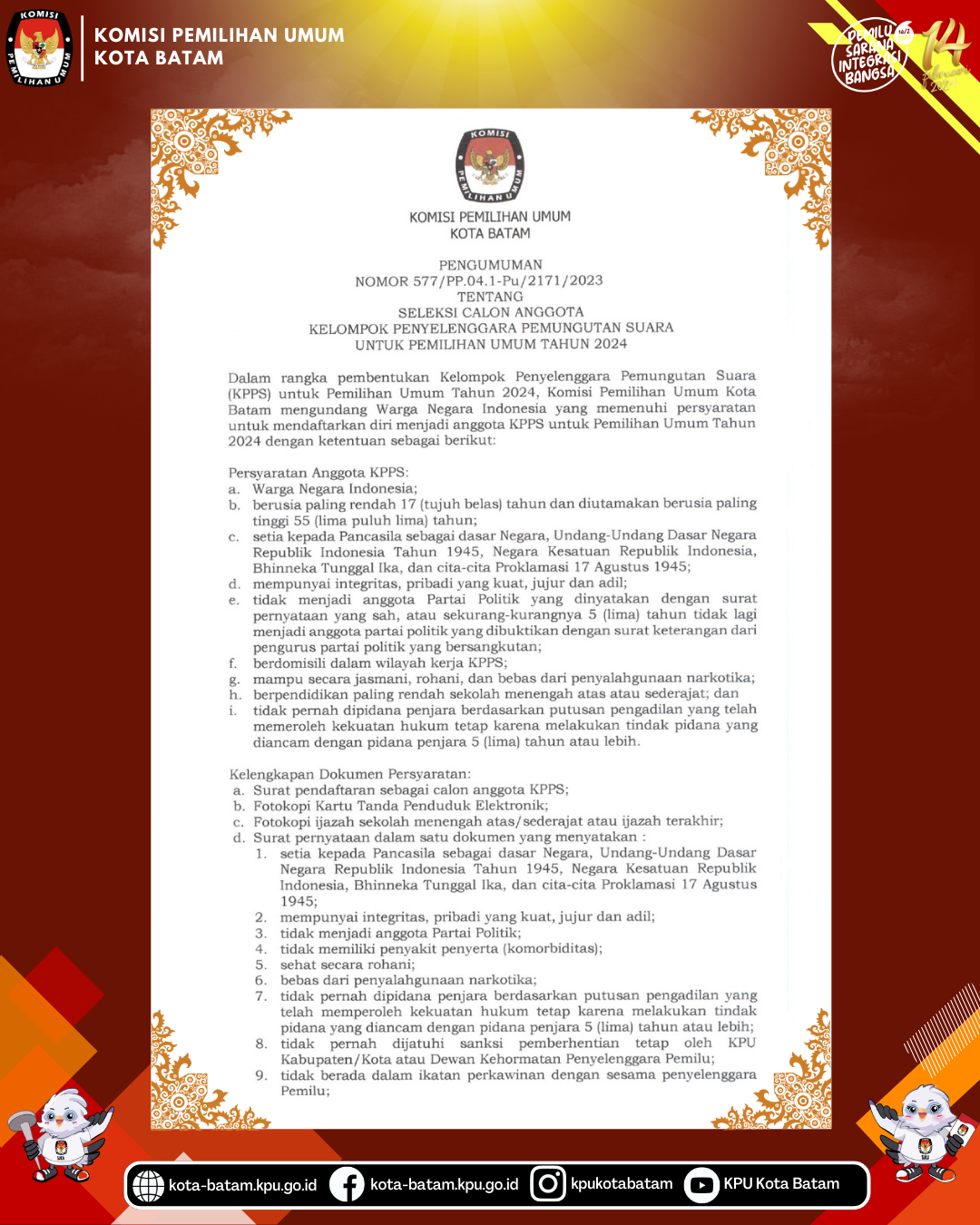 Halo#Temanpemilih Berikut Pengumuman Tentang Seleksi Calon Anggota Kelompok Penyelenggara Pemungutan Suara (KPPS) untuk Pemilihan Umum Tahun 2024, dapat di cek dipostingan instagram kami https://www.instagram.com/p/C0s00pVx6b2/?utm_source=ig_web_copy_link&igshid=MzRlODBiNWFlZA==