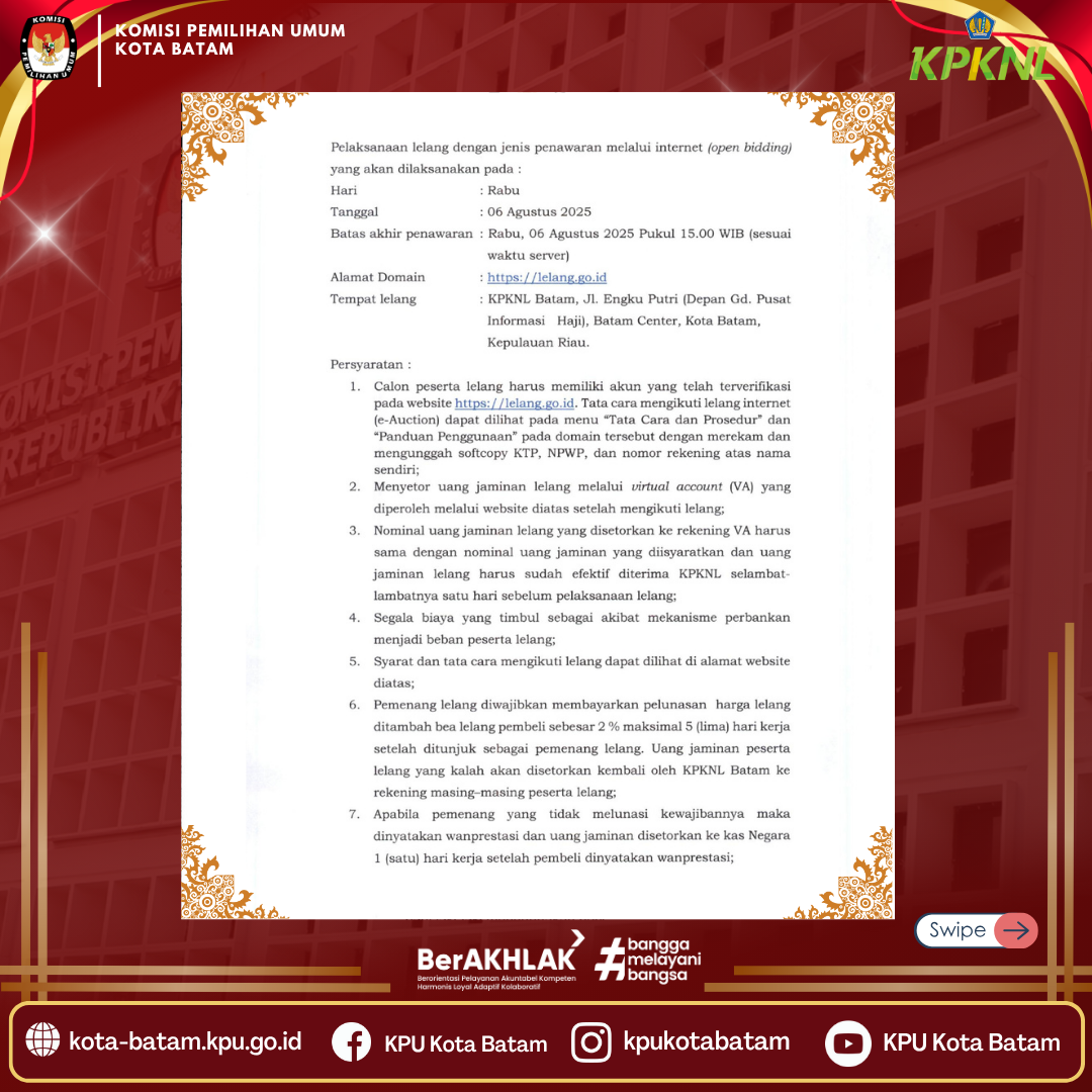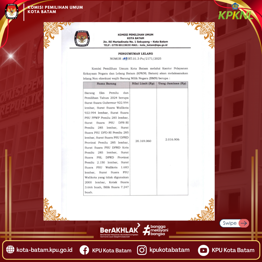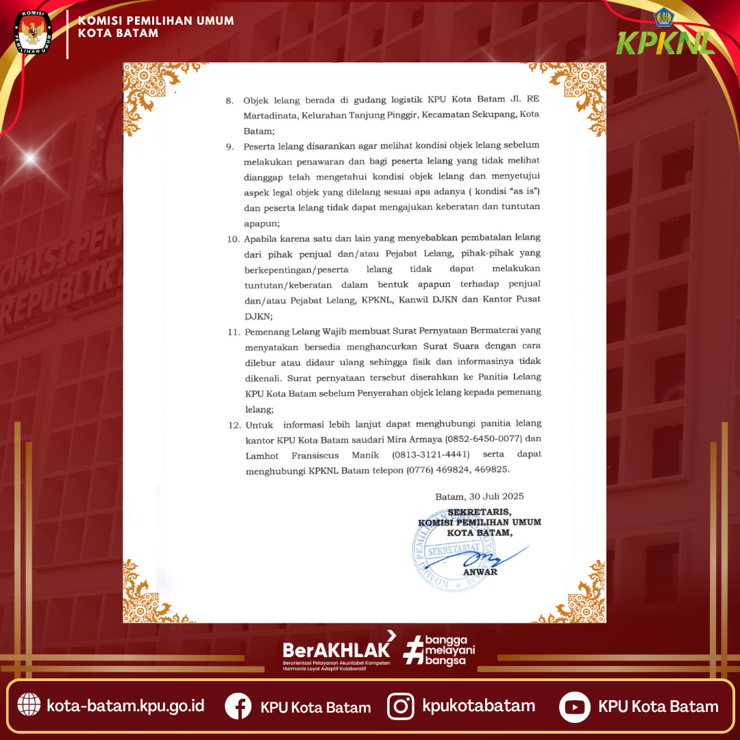 Pengumuman Lelang Komisi Pemilihan Umum Kota Batam Nomor : 149/RT.01.3-Pu/2171/2025 melalui Kantor Pelayanan Kekayaan Negara dan Lelang Batam (KPKNL Batam) akan melaksanakan lelang non eksekusi wajib BMN.