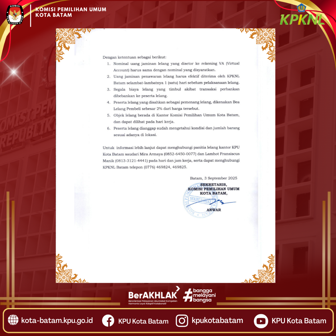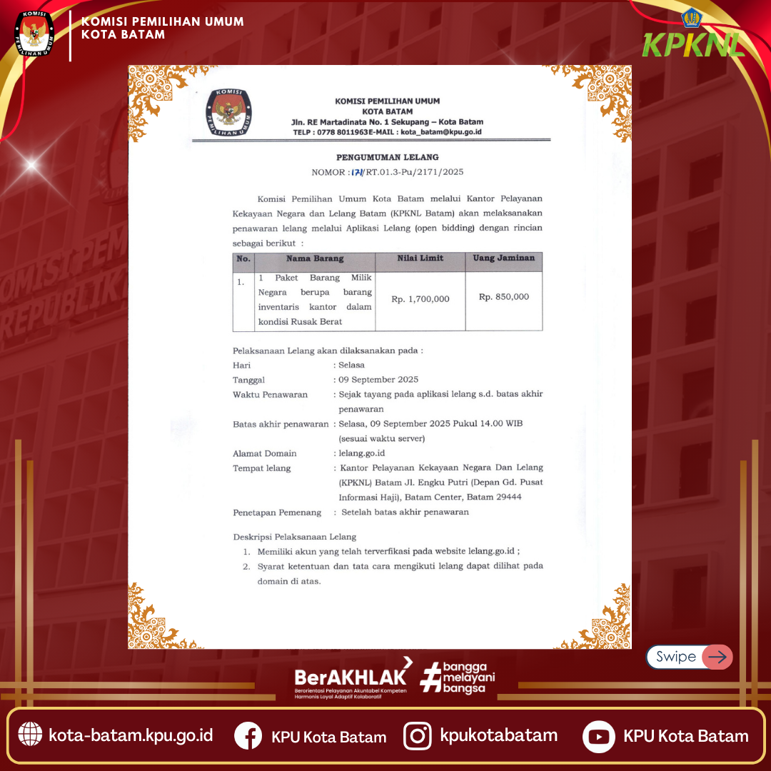 #temanpemilih, berikut adalah Pengumuman Lelang Komisi Pemilihan Umum Kota Batam Nomor : 171/RT.01.3-Pu/2171/2025 melalui Kantor Pelayanan Kekayaan Negara dan Lelang Batam (KPKNL Batam) akan melaksanakan Penawaran Lelang melalui Aplikasi Lelang (Open Bidding)